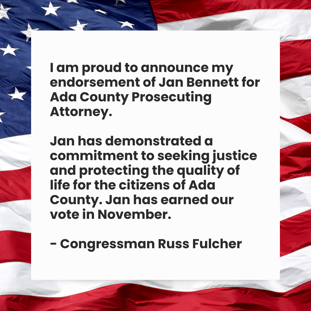 “Jan Bennetts is an experienced, respected, and hard-working prosecutor. Ada County is so fortunate to have her. In a day and age when holding criminals accountable and supporting crime victims has fallen out of style in so many places, Jan continues to put the hard-working, law-abiding citizens of Ada County first by upholding the rule of law and running her office with the very clear goal of supporting and advocating for crime victims in every way possible. She has built an office that is the standard by which every Prosecutor’s office in Idaho ought to be measured. Jan has my confidence, my respect, and my full endorsement.”